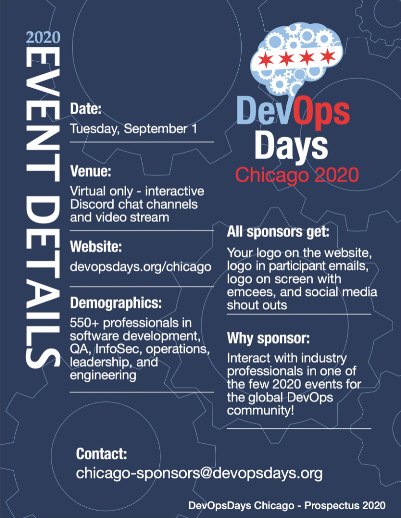 All sponsors will have their logo displayed on the DevOpsDays Chicago website, a tweet before the conference, and a thank you during the conference.